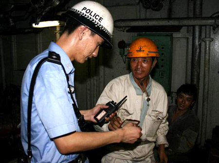 為進一步鍛煉、檢驗應急反應和協同作戰能力,消除對外開放口岸安全隱患,8月9日、10日兩天,(上海)金山邊檢站與市局水上公安局在龍吳路沿江部分對外開放碼頭舉行了代號為“江盾”的聯合演練,通過實戰提高雙方應對口岸突發事件的能力,為奧運盛會的平安舉行保駕護航。演練階段,由雙方分別對碼頭安保工作、登輪管理工作及外輪自管工作展開專項檢查,并向外輪船員、碼頭工作人員宣傳雙方在奧運會舉行期間將采取的服務、管理舉措。值得一提的是,演練過程中,多艘駁船企圖趁夜色非法搭靠外輪從事不法交易,在雙方的密切配合下,成功制止了其不法行為。(新華網上海頻道 記者陳飛 通訊員唐杰攝影報道)