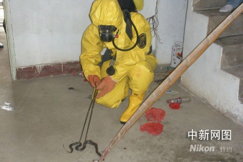 到場的消防官兵經偵查后,決定由中隊朱正庭穿著防化服深入屋內進行捕捉。與此同時,官兵們對現場圍觀人員進行了疏散,防止毒蛇傷及群眾。朱正庭攜帶一根木棍和火鉗進入屋內,在驅趕未果的情況下,成功將毒蛇打死。