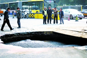 記者在現(xiàn)場看到,大坑邊緣的柏油路面下已懸空。多輛水泥罐車和挖掘機(jī)正在現(xiàn)場搶修,往坑內(nèi)灌注混凝土。市應(yīng)急辦、市公安局等有關(guān)部門及西城區(qū)政府相關(guān)負(fù)責(zé)人趕赴現(xiàn)場指揮。