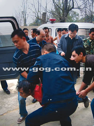 民警通過長達半小時的勸說無效后,強攻組在做好一切防備的情況下,強行將兇手用身體抵住的房門踢開沖進作案現場。歹徒隨著被踢開房門的外力向屋內被“彈出”約兩米,站在死者尸體旁邊。見到多名民警已強攻進屋,兇手繼續負隅頑抗,民警與手持兇器的歹徒進行殊死搏斗時,歹徒踩到死者的血跡摔倒在血泊中,幾名民警迅速將其壓住并奪下兇器將其生擒。