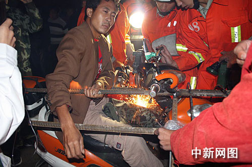 余姚消防大隊接到報警后,調派兩輛消防車9名消防員趕赴現場。在對現場進行了警戒之后,余姚消防大隊的王中隊長利用機動液壓擴張剪先把插入朱先生體內的鋼筋固定后,由另一名消防員用無齒鋸對鋼筋進行切割。為讓切割過程中,朱先生免受高溫傷害,消防員在切割時用水對鋼筋進行降溫,在用完整整一瓶礦泉水后,朱先生終于成功被救出,并送上了救護車。
