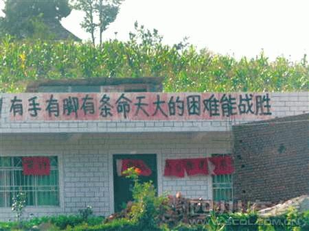 石光武是兩條標(biāo)語的原創(chuàng)者之一,另一位原創(chuàng)者是棗樹村村委會(huì)主任雍明。“地震后,大家碰面都會(huì)說幾句鼓勵(lì)打氣的話,我就想選幾句寫成標(biāo)語,鼓勵(lì)大家不等不靠,自己動(dòng)手重建家園。”石光武的話和另一句被村民經(jīng)常掛在嘴邊的話被雍明選中。7月下旬,“出自己的力,流自己的汗,自己的事情自己干”、“有手有腳有條命,天大的困難能戰(zhàn)勝”兩條標(biāo)語分別貼在村民尚元進(jìn)和村民李玉明家墻上。