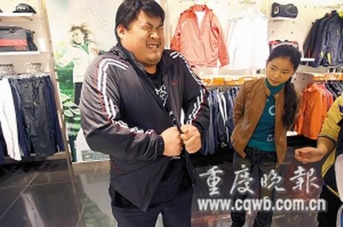 普通衣服不行,寬大的運動服或許可以!在記者建議下,王杰來到南坪步行街的某運動專賣店,店長拿出該店最大的4XL特大裝,王杰連袖管都不能自主穿進去,后在眾人協助下勉強穿上身,卻像成年人穿童裝,明顯不合身。