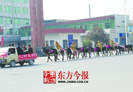 這支“耀武揚(yáng)威”的隊(duì)伍由四名身穿日本帝國(guó)主義軍裝、騎著毛驢的男子組成,由于他們牽的毛驢有十多頭,所以隊(duì)伍有二三十米長(zhǎng)。在隊(duì)伍前方,一輛面包車上還有一支樂(lè)隊(duì),嗩吶聲、镲鈸聲不絕于耳,場(chǎng)面著實(shí)壯觀。