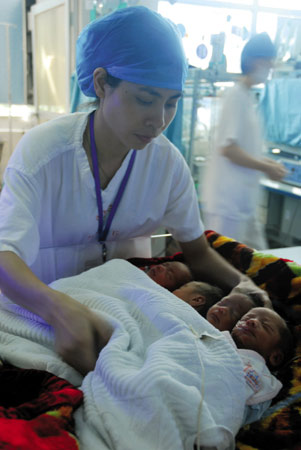 盡管孩子的父親失蹤,孩子們在醫院得到很好的照顧。記者采訪時看到四胞胎躺在嬰兒溫箱里睡得很香。醫務人員告訴記者,四胞胎屬于早產兒,住院前四胞胎中的男嬰肺部出了點問題,吸過幾天氧,現在情況已基本穩定,另外三名女嬰的健康狀況都比較好。