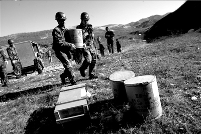 此次銷毀任務(wù)由北京華昌爆破公司承擔,該公司技術(shù)團隊由退役工兵組成。技術(shù)人員搬運炸藥時,記者終于可以近距離目睹這些危險物品的真容。根據(jù)炸藥性質(zhì)和用途不同,這些炸藥有的使用木箱,有的使用木桶和編織袋包裝。梯恩梯炸藥呈黃色片狀,還有的炸藥則是白色粉末。為了確保安全,技術(shù)人員限定,每次銷毀的最大數(shù)量不能超過200公斤。技術(shù)人員分別打開包裝,將不同品種的炸藥分10堆碼放在山谷底部,各堆之間距離在15米左右。據(jù)悉,現(xiàn)場周圍劃定了半徑800米的警戒范圍,多個警戒點均有專人,禁止任何人接近銷毀場地。