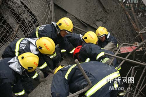 據(jù)了解,鄞州消防大隊(duì)接到報(bào)警,迅速出動(dòng)3輛消防車18名消防戰(zhàn)士到達(dá)現(xiàn)場(chǎng),發(fā)現(xiàn)六七名施工人員已經(jīng)倒在鋼筋水泥中,但幸好不是埋的很深,于是消防戰(zhàn)士就用救援器械將困住受傷者的斷裂鐵架等雜物一一清理掉。