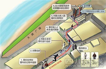 內江市中區人民法院位于鬧市區的民族路中段,商鋪林立且緊鄰沱江邊的大洲廣場。“那天下午大約4時40分,我正好沒生意,看見2名法警將4個人從法院押出來,準備押上停在路邊的警車。”長年在法院大門斜對面擺煙攤的張氏夫婦,是那天眾多目擊群眾中看得最清楚的人。“4個人是在2名法警押送下排隊走出法院大門口的,走在最前面那個小個子沒有戴手銬。剛出法院大門,他趁法警不備將衣服一脫,以飛快的速度沿著街邊人行道直往中醫院方向飛奔而去。見庭審罪犯脫逃,一名身穿制服的法警,一邊大呼‘站住,不準跑’,一邊朝那名小伙子緊追而去。”