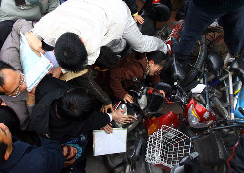 上午10時左右,因進場的學生太多,盡管開放了兩層招聘會場,省人才交流中心仍不得不暫時關閉大門,限制應聘者入場。此時,擠在北門口處的人潮,開始騷動。擁擠中,自動伸縮門被擠掉一半,門口處幾輛電動車的外殼被擠爛。