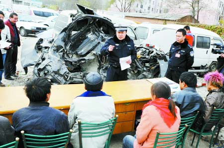 在事故停車場內,民警鄭敏軍將7人帶到了一輛已成廢鐵的事故轎車旁,告訴他們:11月21日,在鄭密路上,一輛東風大貨車在違法超車時,從右前側撞上這輛比亞迪F3轎車,轎車被撕裂為兩半,轎車司機當場死亡。而貨車司機也為自己的行為付出了慘痛的代價。“很多事故都是由我們違法駕駛導致的,眼前就是一個很慘痛的教訓。”鄭敏軍說。