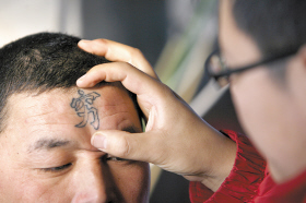 文在哪呢?他想也沒(méi)想,指向了腦門。過(guò)了30分鐘,一個(gè)鏤空的、深藍(lán)色的“窮”字就出現(xiàn)他的腦門上了,這個(gè)字花了他30元錢。