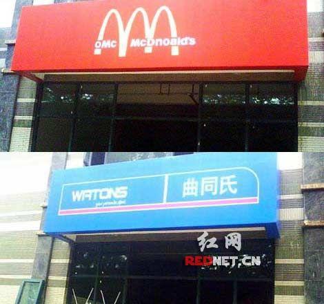 “曲同氏(假冒屈臣氏)、必勝糊(假冒必勝客)、李明(假冒李寧)、巴克星(假冒星巴克)、哈根波斯(假冒哈根達(dá)斯)……”一條掛滿“山寨”招牌的商業(yè)街驚現(xiàn)南京文安街,這條被網(wǎng)友稱為史上最雷的“山寨一條街”,于掛出招牌后沒(méi)幾天在工商部門的干預(yù)之下消失了。(11月9日 紅網(wǎng))