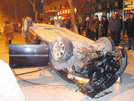 昨天晚上9點(diǎn)40分左右,渭南市建設(shè)局一位副局長(zhǎng)的小轎車在東風(fēng)大街逆行百余米,從綠化帶越過(guò)并撞倒10多米高的路燈桿后四輪朝天。事故造成人行道上一位騎自行車帶著4歲孩子的母親死亡,孩子受傷被送醫(yī)院治療。 記者 石俊榮 攝