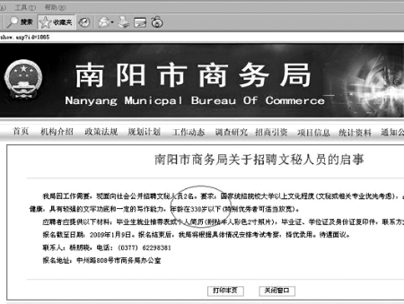 這不,南陽市商務(wù)局網(wǎng)站就有消息稱:商務(wù)局招聘兩名文秘,要求年齡不能超過330歲。