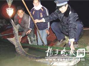 中華鱘靠岸后,當(dāng)?shù)夭簧偃罕娐動嵑髞淼浆F(xiàn)場看稀奇。記者看到,中華鱘背部灰黑,腹部雪白,魚嘴長在魚頭下部,嘴前方有4根肉質(zhì)胡須,被暫時“制服”的中華鱘仍然不“老實”,身體不時地在水中大幅度擺動。隨后趕到的邗江區(qū)漁政部門工作人員,從“大魚”的體表、體態(tài)、規(guī)格、背骨的角質(zhì)化程度斷定,這條“大家伙”為野生中華鱘,經(jīng)現(xiàn)場檢測,中華鱘長約2.2米,胸圍約80厘米,重約250斤,如此大的“個頭”,是近10年來沒有發(fā)現(xiàn)過的。當(dāng)晚9時,漁政人員對中華鱘的身體進行了認(rèn)真檢查,確認(rèn)沒有受到傷害后,對它進行了拍照。9時15分,漁政人員和胡長發(fā)父子用生產(chǎn)船小心謹(jǐn)慎地把中華鱘拖到夾江中心,中華鱘擺動碩大的魚尾,悄然游向遠處。