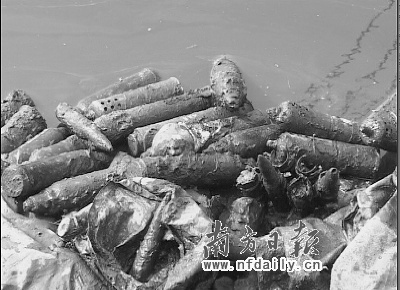 昨日上午,在廣州白云區石井河涌邊,打撈垃圾的環衛工人在泥堆中發現許多炮彈(見上圖,市民提供)。目前,警方已將附近封鎖,等待退潮后打撈處理。
