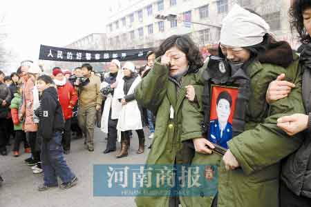 在前往遺體告別儀式舉行地——中牟縣殯儀館時,不足5公里的路段,送行的隊伍被4次攔住,行走了一個多小時。途中不少負責執勤的交警,一只手在敬禮,而另外一只手則悄悄在抹眼淚。