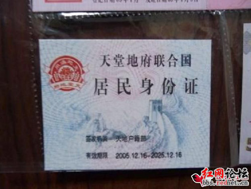 最“雷人”的是冥幣上印制的內容!其中“天堂地府聯合國居民身份證”,發證機關是天地戶籍部,最有“創意”的要屬其“國徽”了,上面印有國名“天堂地府”,還有“天地通用”四個字樣。而神通廣大的“天地通用”的紙幣,發行銀行是“天地銀行有限公司”,上面的圖案是傳說中的玉皇大帝。