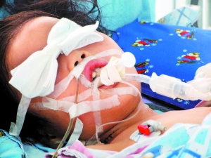 黃蓉今年6歲半,四川人。上了呼吸機的黃蓉被蒙著雙眼,躺在病床上,雖然有心跳,但對外界的刺激毫無反應。主治醫生說,其病情危重,“已接近腦死亡”。