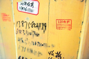 記者還在該院男、女廁所的門板、瓷磚、水管等處看到遍布的“救護車接送病人”、“出院用車”、“包車”、“病人接送車”、“120救護”等不同字樣的廣告標貼,上面的所有電話都是私人手機號碼,個別廣告標貼上甚至還配上了車輛圖片,顯得“很真實”。