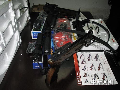 摸清情況后,派出所民警于當(dāng)日下午突然出現(xiàn)在該服裝檔口,從店內(nèi)搜出小飛狼牌弓弩3把(弩是一種利用彈簧裝置發(fā)射箭頭和鋼球的器具,有較強(qiáng)大的殺傷力,查獲的小飛狼牌弓弩的最大射程能達(dá)到60米,精確射程為40米 )、超高壓交流脈沖電警棍3支、超高壓防爆自衛(wèi)器共1支、獵箭550支和鋼珠彈89顆。這些器具都具有非常大的殺傷力和社會(huì)危害性,一旦落入犯罪分子手中,后果將會(huì)不堪設(shè)想。