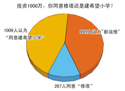 截至昨天下午5時,大渝網(wǎng)發(fā)起的調查顯示,你認為修建第一高塔有必要嗎?2475人參與投票,1154位網(wǎng)友認為“沒必要,又是面子工程”;1091人認為“為了導航,也能增添新景觀”。在“投資1000萬,你同意修塔還是建希望小學?”的調查中,網(wǎng)上2271人參與投票,1009人認為“同意建希望小學”;267人同意“修塔”。