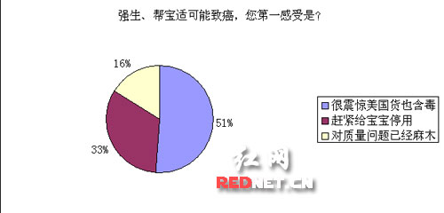 近日紅網一項得到近5000張投票的專題調查顯示,近51%的網友聽聞此事后感覺震驚,近97%的父母表示近期或今后將不再使用強生、幫寶適等美國品牌嬰兒衛浴產品。如果含毒事件為真,64%左右的使用者會對這些產品提出控訴。
