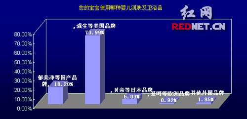 另外,調查顯示近74%的父母為寶寶使用強生、幫寶適等美國品牌衛浴產品,其次有18%使用郁美凈等國產品牌,其他外國品牌的使用率不足8%。
