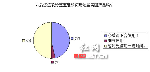對于今后是否還會使用強生、幫寶適等產品,近47%的網友表示“以后都不會使用了,寶寶的生命要緊”,近50%的網友表示“持觀望態度,暫時停用一段時間”,兩者總和高達97%。僅剩下3%的網友明確表示,將繼續使用這些品牌的產品。(董雷)