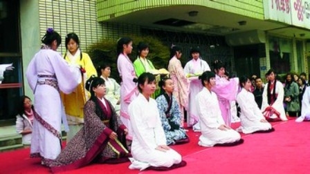 古時女子在15歲都有成人禮,謂之“笄禮”,是女性一生中最重要的禮節之一,可與婚禮并重。昨日下午,湖南師范大學五舍廣場前上演了“時空錯位”的一幕:三名妙齡美眉身著寬袍大袖的漢服,在一大群穿牛仔褲、T恤,手持數碼相機的大學生圍觀下,集體接受了成人禮。據悉,這是湖南首次集體舉辦女子漢服成人禮。