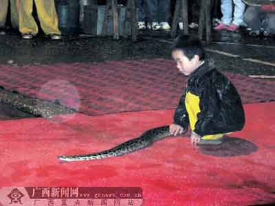 表演團(tuán)體的主持人稱,這條蟒蛇有5公斤多重,“小毛毛”(年紀(jì)較小的表演人員)待會(huì)兒將斗蛇,而且還將騎在蟒蛇身上,就像騎馬一樣。當(dāng)時(shí),小毛毛不斷挑逗著蟒蛇,不時(shí)怕打著蟒蛇的尾巴。該團(tuán)體主持人還說:“我們還有一條30多公斤的蟒蛇,小毛毛待會(huì)也將騎在它身上。”