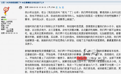 “現(xiàn)在婚姻都得先考慮對(duì)方有沒有房和車”,近日,網(wǎng)友“aijiay”在紅網(wǎng)論壇貼出一篇題為《26歲的我離婚了!80后婚姻注定死在房子上》的帖,帖中稱83年出生的她兩年前與82年出生的老公在北京租房完婚,后因“身邊的同事有車有房”而萌生買房念頭,最后卻因手頭拮據(jù)多次發(fā)生爭吵后離婚。此帖短短幾日引來網(wǎng)友陣陣熱議,支持有贊賞同在,也有人無奈感嘆。