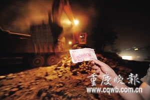 昨日傍晚,沙坪壩區(qū)雙碑光榮坡一拆遷工地上,挖掘機(jī)挖出一堆錢。正在現(xiàn)場的拾荒者和附近群眾,一擁而上爭搶這些錢財(cái)。當(dāng)晚,該房原主人蔡先生獲知消息后趕到現(xiàn)場,只撿到幾片被撕碎的人民幣碎片。蔡表示,自己遺忘在房內(nèi)的錢至少有四五萬元。
