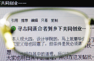 “但會有愿意去鄉下的女孩么?”“OXY-001”在BBS上發帖《尋志同道合者到下鄉共同創業》!癘XY-001”在帖子里說:“你要是夢想著找一帥哥就別來了,你要想找一錢包就別見了!你要真是一仙女我也接不住,沒期待您長得跟畫報封面一樣,能做賢妻良兒媳,外表時尚,內心保守,身心都健康的一般人就行,要是多少還有點婉約那就更靠譜了!”