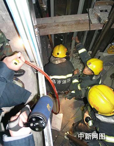 21時21分,消防官兵到場后發現,事故現場是一幢在建的高層住宅樓,據安裝電梯的一名負責人講,事發前電梯停在28樓,當時有兩名工人在電梯內施工,其中一名在轎廂頂部,另外一名則在轎箱內部,電梯突然失去控制后向下墜落,一直墜到了底層,兩名工人全部被困。電梯間內則堆滿了鋼絲繩和一些零部件,轎箱根本無法向提升,現場的工人們只把轎廂上面的那名工人救了出來,而轎廂被壓在了底層,加一名工人仍被困在轎廂內。