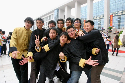 這組畢業照片,說明是廣州大學新聞學院畢業留影,看得出來是在教學樓前拍攝的,十幾個女生穿著長短不一的旗袍,手拿扇子或鮮花,一字排開,伸出腿擺造型,男生則穿著唐裝拍照。有集體合影,也有搞怪的照片。“潮爆的大學生決定搞搞新意思,讓象征中華文化的唐裝定格人生最重要的瞬間!碧咏榻B:以往師兄師姐拍畢業照總是清一色的西方學士袍,于是有女生提議,不如女生穿旗袍男生穿唐裝,得到全班同學熱烈響應,并為班主任購買了唐裝一同合影。