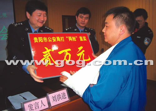 4月28日,貴陽市公安局召開“打擊‘兩搶一盜’犯罪、偵破命案”有獎舉報獎勵兌現新聞發布會,包括協助特警擒獲嫌疑人的的哥鄭宏等37名見義勇為的市民受到獎勵,警方為這37名市民兌現獎金共計157000元。