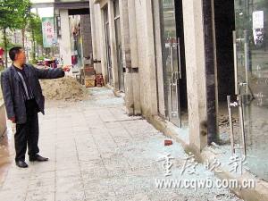 昨日下午,記者在現(xiàn)場(chǎng)看到,A1-14、15號(hào)門面各有一扇鋼化玻璃門受損,16號(hào)門面有兩扇玻璃門被毀,而14號(hào)門面上的二樓房間,也有一塊玻璃破碎。