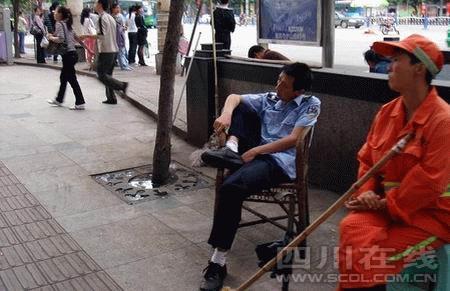 昨日,照片里的主角,宜賓市翠屏區市容管理局南城中隊協管員李劍勇表示,單位領導已批評教育他了,自己影響了宜賓和宜賓城管的形象,他表示非常抱歉!爱敃r所有的攤點都已規范位置了,想坐著休息下。”李劍勇說,城管協管員沒有固定工作點,他便在游攤最易出現的南門橋頭坐著休息會兒,他希望所有的城管隊員都將他作為反面教材,在以后的工作中注意紀律和形象。