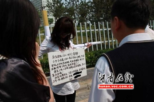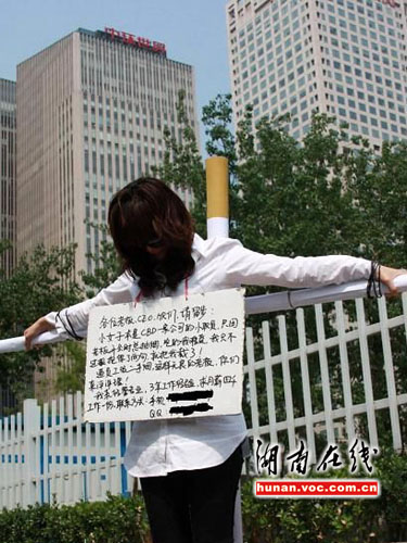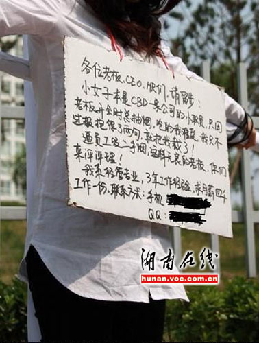 圖中女子身著修身白襯衣和黑色長褲,大幅框架眼鏡以及垂下的頭發(fā)遮住了臉,讓人看不清容貌。身上所背的十字架高出其頭頂,上面還有個過濾嘴,狀如香煙。據(jù)其胸前牌子上的文字描述,該女子是一“失業(yè)白領(lǐng)”,原老板喜歡在會議室吸煙,自己因受不了二手煙的危害,發(fā)了幾句牢騷,結(jié)果被老板辭退,所以采用行為藝術(shù)方式來求職。