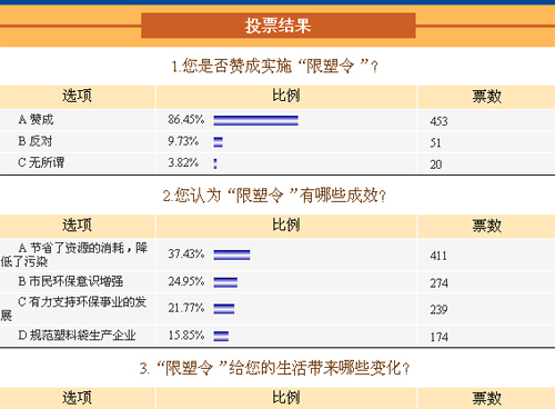 在參與調查的網友中,有86.71%贊成實施“限塑令”,僅有9.44%表示反對。