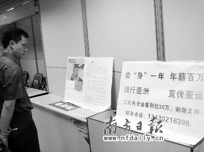 招牌有兩塊,一塊寫著“賣‘身’一年,年薪百萬。3天內資金要到30萬,謝謝支持!”的字樣,并粘貼著賣身者蔡開仕的聯(lián)系方式。另一塊則粘貼著整版的某媒體關于“騎行亞洲、宣傳亞運”活動的報道。