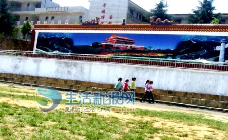 6月16日14時許,記者來到離曲靖市區約10公里的寥廓街道中學。足球場旁,一堵長約400多米,高約2米的圍墻異常醒目,面對教學樓的那一段圍墻,卻突然高出了一截。墻頭鑲嵌有黃色琉璃瓦,上面屹立著有藍黃琉璃瓦做成的兩龍戲珠,而墻壁中間則是一幅北京天安門城樓油畫。