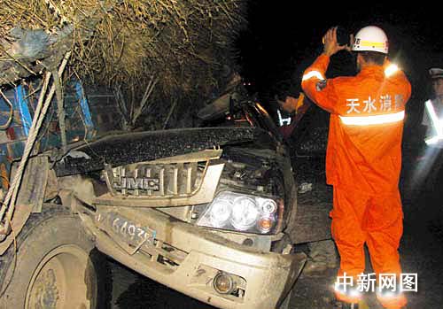消防官兵到達現場后,發現一輛車號為川H64935的皮卡車撞進與同向行駛的一輛車號為甘E03749載有秸桿的貨車左側的后輪胎處,“皮卡”車身嚴重損壞,地面血跡斑斑。車禍致“皮卡”車上一人當場死亡,“皮卡”內另有兩名傷者隨即被先行趕到的120急救車送往醫院救治。