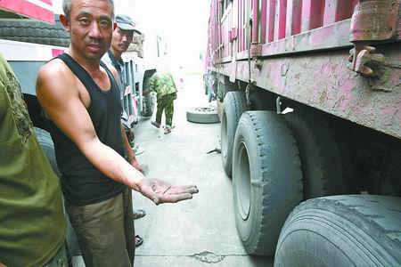 約半小時后,記者趕到京港澳高速鄭州東服務區。西側服務區停車場里,仍停有七八輛被扎破輪胎的貨車,每輛車被扎爛輪胎1至3只不等。司機們一籌莫展,不停嘆氣。