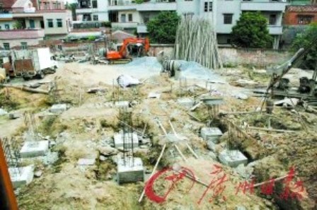 在村民的指引下,記者來到這片工地。該工地占地面積大約200平方米,一臺10來米高的打樁機豎立在工地中央,10來個水泥樁基已經澆筑完畢。工地四周全是普通民居,工地離部分民居非常近,一些施工范圍甚至已到民居的屋檐下、窗臺下,而最近的水泥樁基離民居不超過3米。