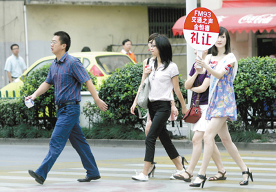 昨天上午8點(diǎn),杭州市莫干山路的愛心斑馬線前,幾名佳麗朝著南來北往的車輛,舉起了鮮亮的“禮讓”牌。