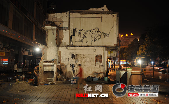 9月24日凌晨0:56,“長沙最牛釘子戶”墻角的一些夜宵攤在慢慢撤離。