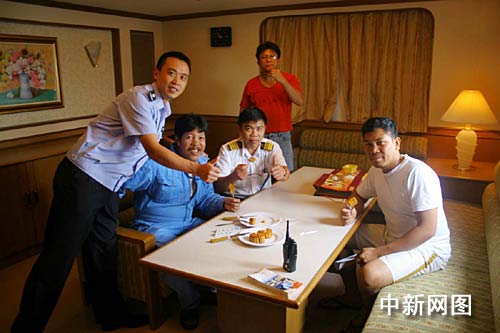 “趕快讓大家都過來,有月餅吃!贝L告訴助手,十幾個船員陸陸續續來到船長辦公室,狹小的船艙一下子熱鬧起來!癎ive me one.”(給我一塊。)“It’s delicious.”(真好吃。)