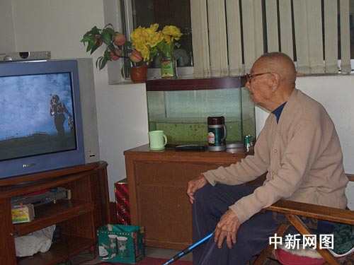 97歲的老紅軍戰士鐘枝棋在家中認真收看國慶慶典。